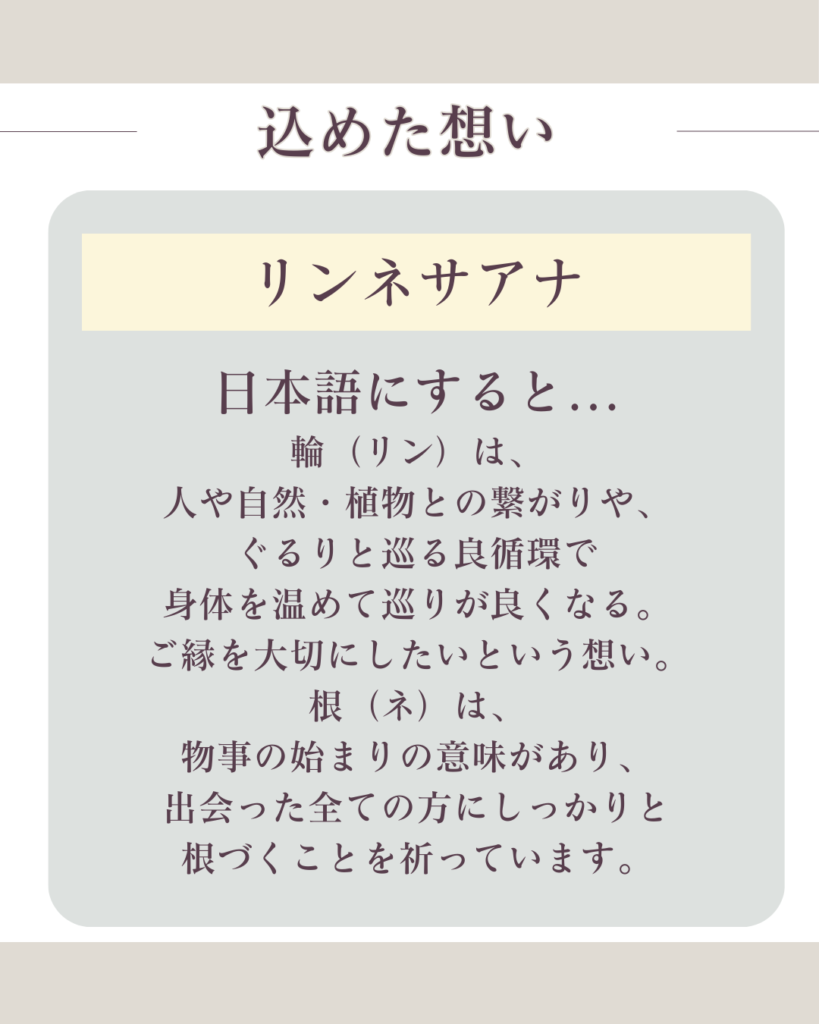サロンの名前は、【Linné Sana】リンネサアナです。生物分類学を確立させた博物学者、生物学者、植物学者である「カール・フォン・リンネ」のLinné(リンネ)と、ラテン語で「癒す」の意味を持つSana(サアナ)の造語です。